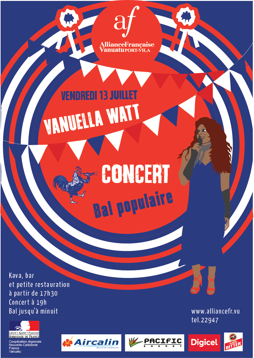 Afin de célébrer la Fête nationale française, l’Alliance Française organise un concert-bal avec la chanteuse Vanuella Watt le vendredi 13 juillet en soirée.