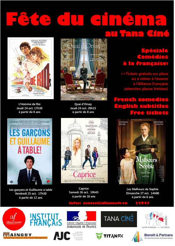 L'Ambassade de France au Vanuatu, Tana Ciné, l'Alliance Française et le Lycée JMG Le Clézio ont le plaisir de vous inviter à la Fête du Cinéma français qui se déroulera du 24 au 27 octobre. Les séances ont lieu à Tana Ciné.
