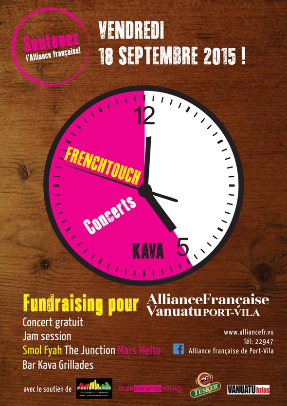 Le vendredi 18 septembre, l'Alliance française de Port-Vila vous donne rendez-vous à partir de 17h pour une soirée de soutien. Une tombola sera également organisée. Les bénéfices de la soirée contribueront à compenser en partie la baisse des ressources de l'Alliance due à l'affaiblissement des effectifs des étudiants et des parrainages des sociétés privées suite au passage destructeur du cyclone Pam. L'Alliance française de Port-Vila compte sur vous!