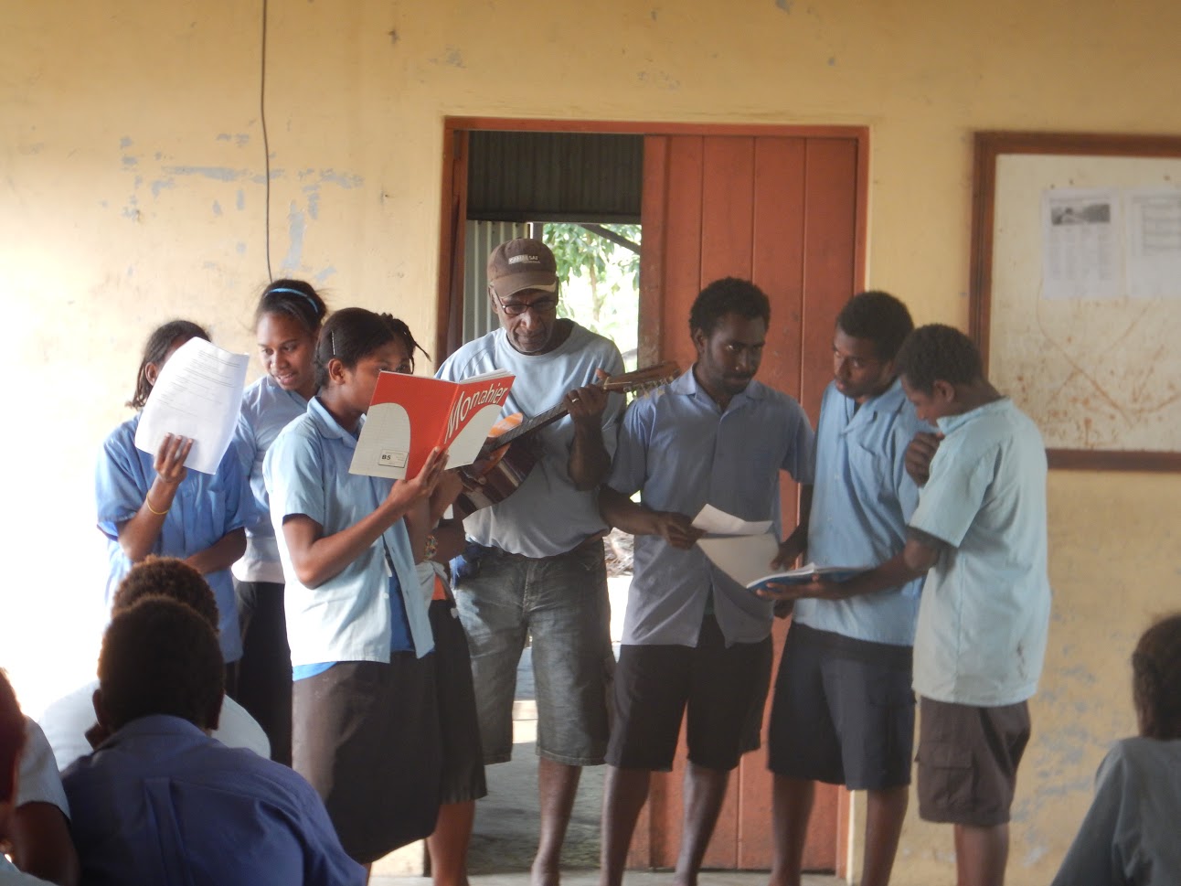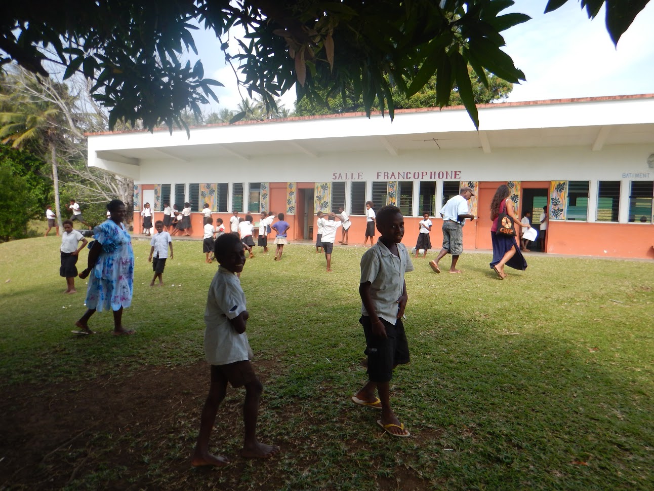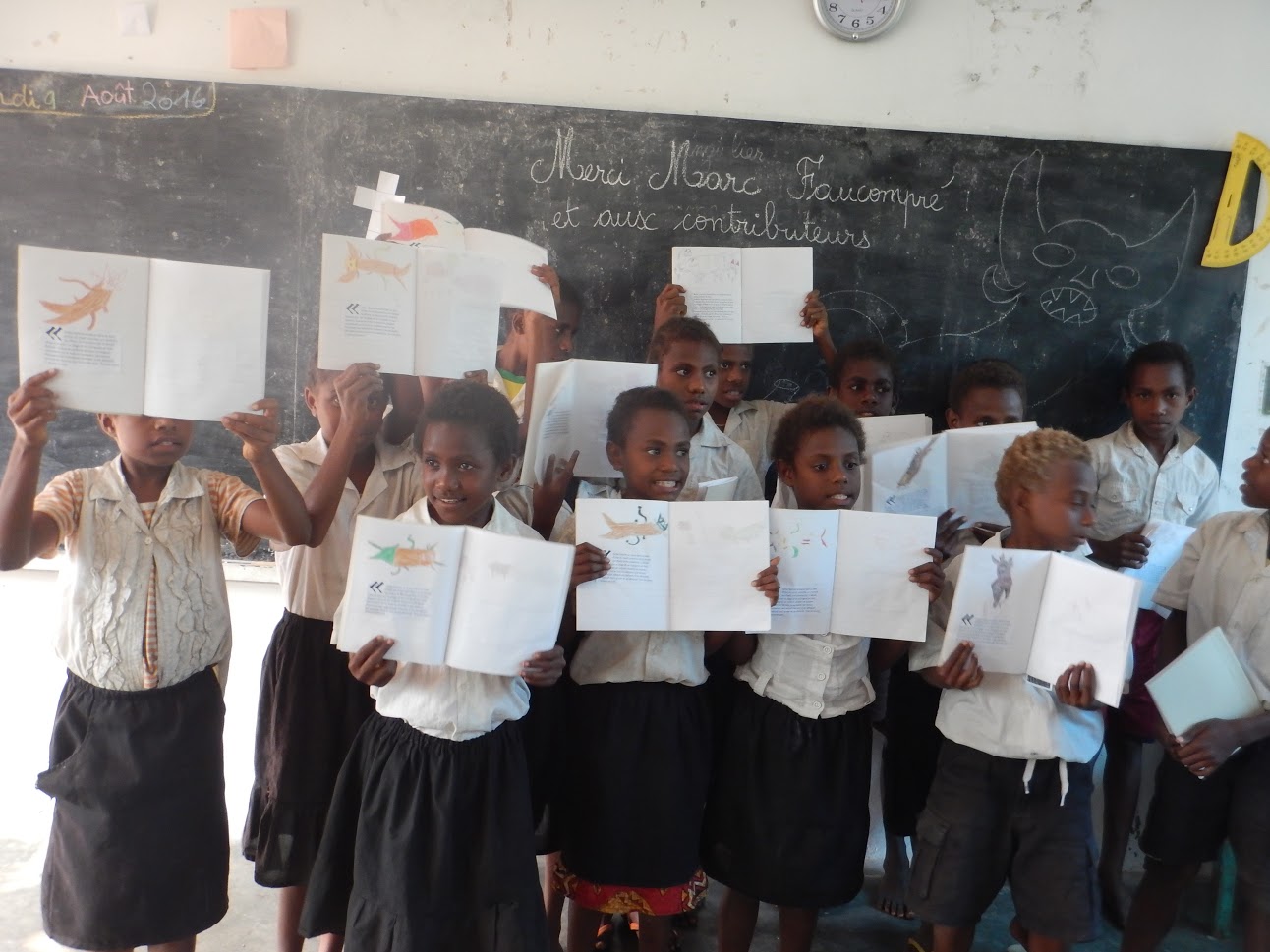 Les 10 et 11 août 2016 se sont déroulés des ateliers créatifs avec les élèves des écoles et la remise de fournitures. Le mardi après-midi a eu lieu la lecture de la légende devant tous les enfants de l'école primaire d'Olal sous le préau de l'école. Ce fut une lecture à deux voix en français et en langue locale avec Lucie Anaclet, stagiaire à l'Alliance française, et Léon Buroro, ancien enseignant, habitant du village. Elle a été agrémentée par la démonstration d'un joueur traditionnel à la flûte de bambou. S'en est suivi un atelier avec la classe de l'année 8 (20 enfants d'environ 8 ans) pour réaliser un petit carnet illustré avec la légende accompagnée de dessins. Des fournitures ainsi que des livres ont été donnés à la directrice de l'école : cahiers, gommes, tailles crayons, stylos, un dictionnaire Larousse illustré et des livres pour enfants (l'école dispose d'un seul dictionnaire pour toutes les classes et de très peu de livres francophones). Le mercredi toute la journée, les élèves des années 9 et 10 du collège de Tobol (à une heure à pied d'Olal) ont participé à un atelier d'écriture de chansons sur le thème des légendes et de leur île en français, bichlamar et langue locale. Ils étaient accompagné par Léon Buroro, également musicien. A la fin de la journée, les élèves ont montré leur réalisation devant les autres élèves de l'école. C'était surprenant pour eux d'écrire dans leur langue quotidienne. Une autre représentation aura lieu devant les familles après retravail des chansons avec les professeurs et M. Buroro. L'école a reçu un dictionnaire (le premier du collège), des cahiers, des crayons de papier, des crayons de couleurs, et des livres de littérature locale, calédonienne et française. Le proviseur du collège Monsieur Norbert, était ravi de recevoir la visite de francophones, premiers visiteurs du collège depuis sa création en 2003. Storian Blong Yumi n'est qu'une étincelle qui souhaite contribuer à l'échange entre francophones du Vanuatu et de France, dans les respects des cultures locales dont les enfants sont l'avenir et le relais. Le projet Storian Blong Yumi a été réalisé grâce au soutien de 19 contributeurs, notamment Florent Aceto, Christine Anaclet, Daniela Carneiro Fuentes, Anne et Jean-Marie Certoux, Georges Cumbo, Marc Faucompré, Isabelle Fayli, Arnaud Grosleron, Ingrid Jean, Julie Pecclet. Les livres ont été offerts avec le soutien de l'Alliance française avec le concours de la coopération régionale Nouvelle-Calédonie / France / Vanuatu.