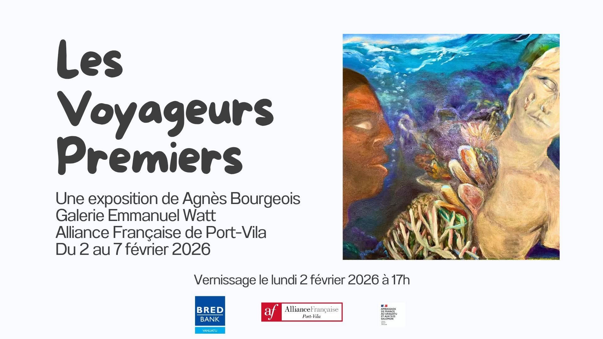 Bonjour Visiteur, Vous êtes cordialement invité(e) au vernissage de l’exposition d’Agnès Bourgeois Agnès Bourgeois, enfant du pays et élève des Ateliers de la Ville de Paris, expose à la Galerie Emmanuel Watt / Alliance Française de Port-Vila du 2 au 7 février 2026. La première partie de l’exposition explore les temps d’avant J.-C. et d’avant la colonisation. Qu’il s’agisse des premiers Mélanésiens arrivés en pirogue ou de figures mythiques gréco-romaines, grands voyageurs venus des antipodes, ces personnages se rencontrent sur une terre nouvelle. La connexion à la nature, à la terre et à la mer offre les conditions idéales d’une adaptation mutuelle. C’est ainsi qu’ils cohabitent harmonieusement, au-delà de leurs identités distinctes. La seconde partie de l’exposition nous ramène au présent et propose une série de portraits hybrides : des femmes d’aujourd’hui fusionnent avec des espèces marines ou végétales océaniennes, ouvrant un dialogue poétique entre humanité et monde vivant. Exposition organisée par Agnès Bourgeois et l’Alliance Française de Port-Vila, avec le soutien de l’Ambassade de France au Vanuatu et de BRED Bank Vanuatu. Soirée organisée avec le soutien de Bred Bank Vanuatu. |