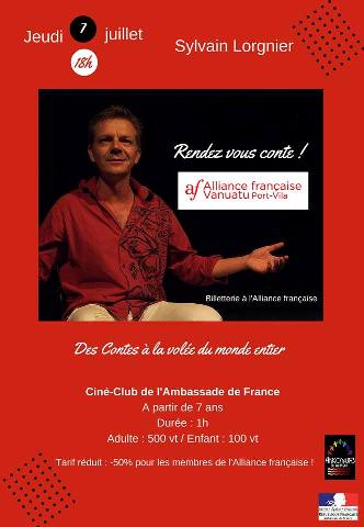 Jeudi 7 juillet à 18h, l’Alliance française vous propose un spectacle de contes ! « Rendez vous conte », par le conteur calédonien Sylvain Lorgnier. Des contes à la volée du monde entier pour petits et grands à partir de 7 ans au Ciné-Club de l’Ambassade de France. L’artiste propose de nous régaler les oreilles avec ses histoires venues d’ici et d’ailleurs, qui racontent surtout l’Homme de partout, ici au Vanuatu. Venez chercher vos billets à l’Alliance française ! Le nombre de places est limité. Billetterie aux horaires de la médiathèque : le lundi de 12h à 17h30, du mardi au vendredi de 10h à 17h30, le samedi de 9h à 12h et. Tarif adulte : 500 vt / Tarif : enfant : 100 vt. Les membres de l’Alliance française bénéficient d’un tarif réduit de -50% ! Le conteur et comédien Calédonien Sylvain Lorgnier de la Compagnie les Artsgonautes du Pacifique nous fait le plaisir de revenir à Port-Vila ! Celui-ci était déjà venu nous faire partager ses histoires en avril dernier pendant Pirogue, le premier salon du livre de la ville. Lui et son compagnon de scène Erwan Botrel avaient remporté un vif succès. Pour ceux qui le souhaitent, Sylvain invite à une rencontre -discussion, le mardi 5 juillet à 17h au Ciné-Club, autour de la création d’une association socio-culturelle pour créer du lien entre le Vanuatu et son île soeur la Nouvelle-Calédonie. « Nous serions heureux de pouvoir compter parmi nous toutes les personnes qui œuvrent à garder ce pays au plus beau de ce qu’il est. » |